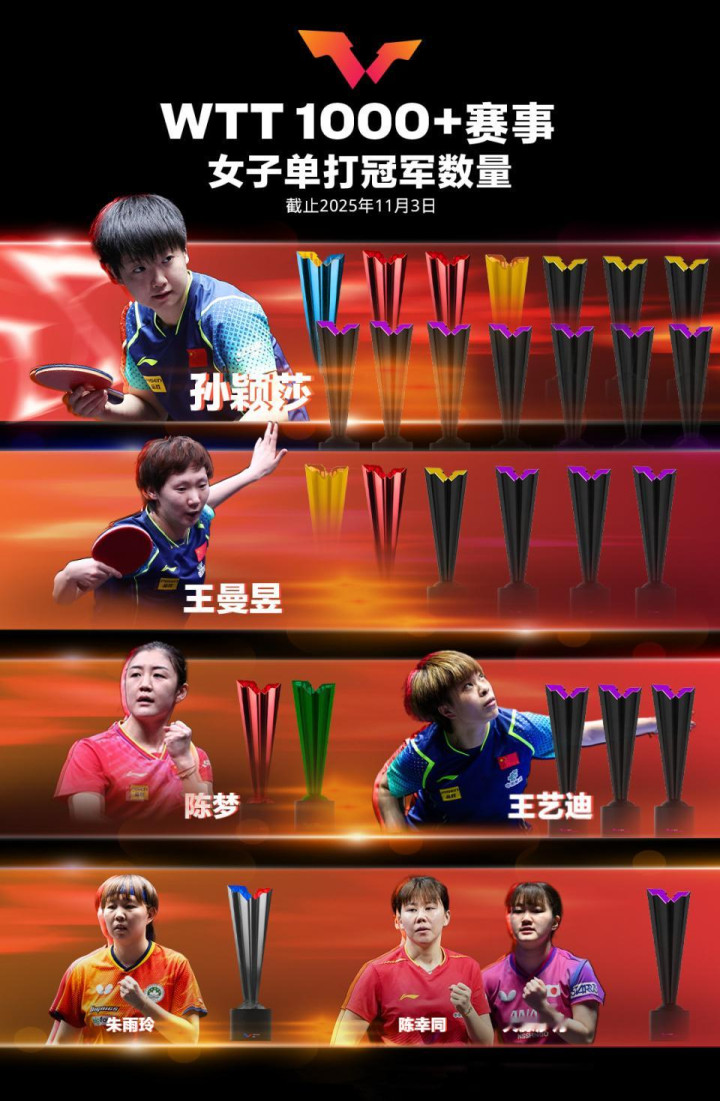 随着这次夺冠,王艺迪的个人WTT冠军赛奖杯数量增至3座,正式超越陈梦的2座,在现役女单选手中仅次于孙颖莎和王曼昱,这一超越的意义远非数字表面那么简单,在国乒女队竞争异常激烈的情况下,王艺迪用实实在在的成绩证明了自己的成长与突破!
