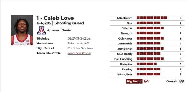 受口罩特殊政策影响,乐福在亚利桑那大学又打了两年,但依然未能打出统治级的亮眼表现,今年他以大五毕业生身份自动参加选秀,因为他是从高中就备受瞩目又打了五年大学的高龄秀,球探对他的能力可以说是了如指掌,所以他的选秀报告非常精准,我放上NBA DRAFT网站的选秀报告,综合评分89分(在尺寸、强壮度、领导力、NBA准备、潜力、传球、无形资产方面都评分较低),预计选秀顺位落选,选秀模板拉沙德-麦坎茨(2005年首轮14顺位秀)。