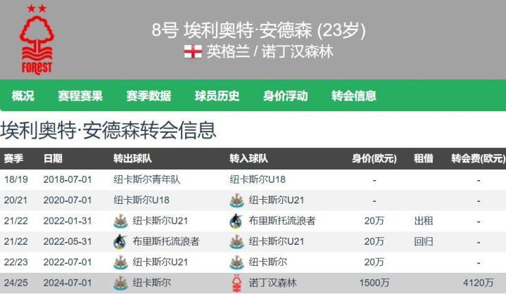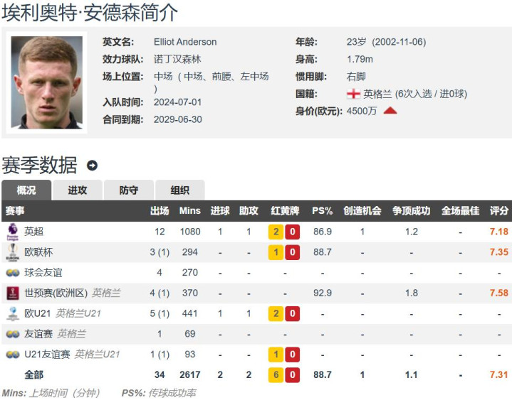 安德森现年23岁,身高1.79米,右脚球员,能踢中场多个位置,与诺丁汉森林的合同至2029年,德转估价4500万欧元。安德森本赛季至今各项赛事已经为诺丁汉森林出场16次,其中15次首发,合计出场1374分钟,贡献1球1助。