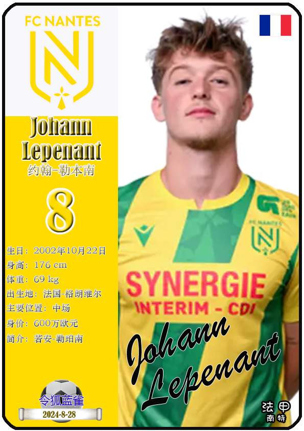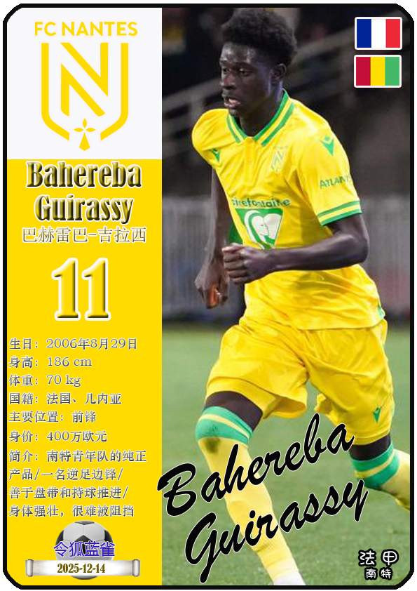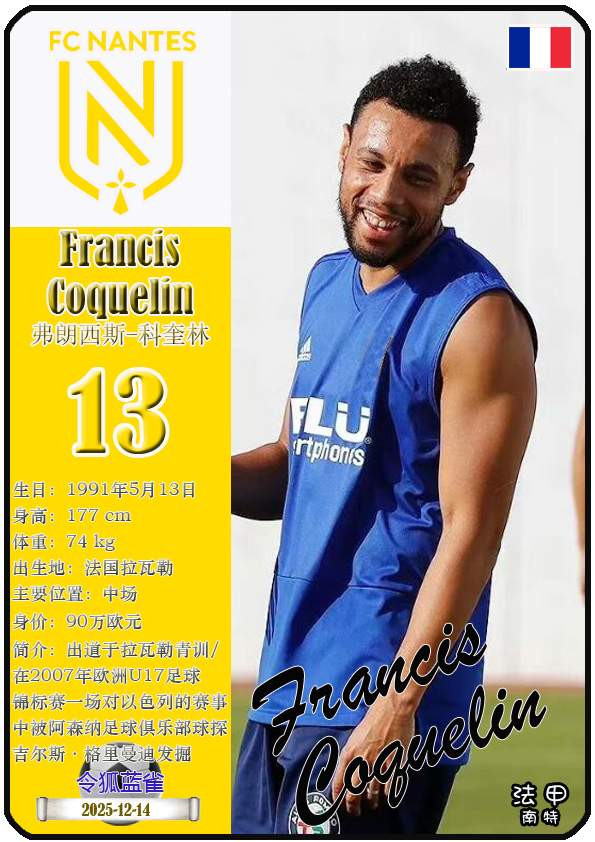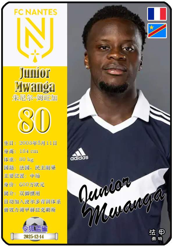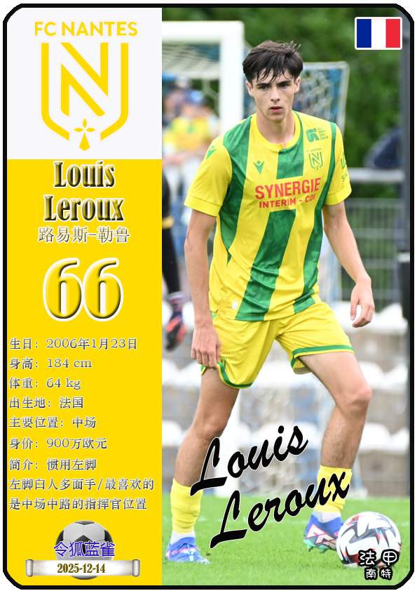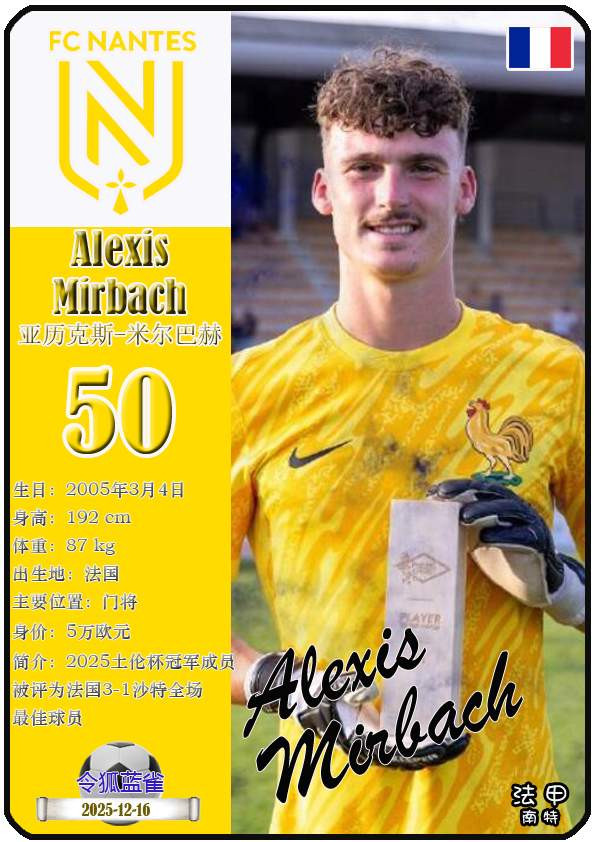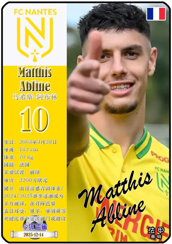 法甲南特足球俱乐部成立于1943年,距今已有82年历史。截至2025年12月17日,球队主教练是艾哈迈德-坎塔里,队内拥有球员马希斯-阿布林、洪贤锡、巴赫雷巴-吉拉西等。本期以球星卡的形式展示目前法甲南特足球俱乐部的21名球员(按球衣号码排序):1 安东尼-洛佩斯