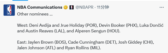 东部:布朗(凯尔特人)、坎宁安(活塞)、吉迪(公牛)、杰伦-约翰逊(老鹰)、罗林斯(雄鹿)
