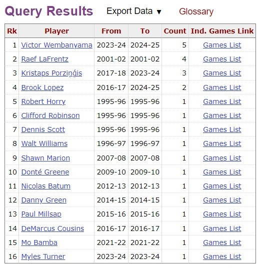 此战之后,文班至少5记三分5次盖帽的场次来到6次,继续位列历史第1。