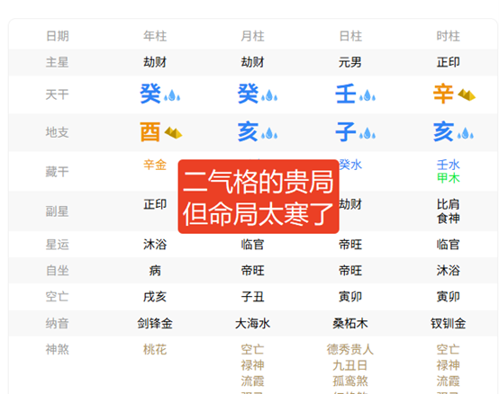 上述命局金水二气格,属于贵局了,水主智力,聪明。